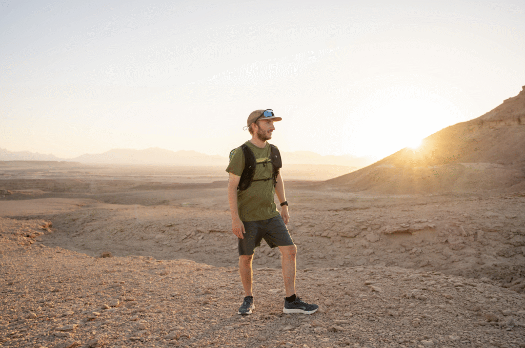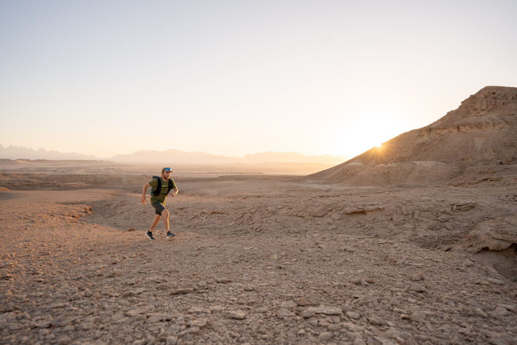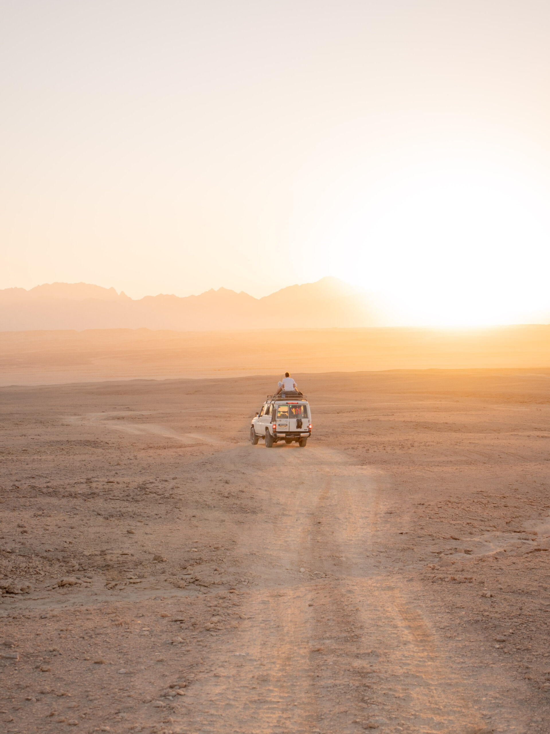 In der ägyptischen Wüste folgt ein Läufer der endlosen Linie des Horizonts, begleitet von einem Land Rover. Die Fotoserie Desert Run zeigt die Begegnung von Mensch, Maschine und Landschaft – ein Spiel aus Bewegung, Hitze und Stille.